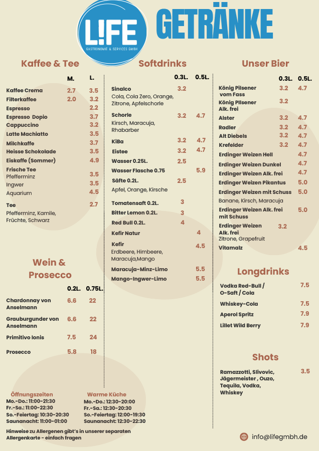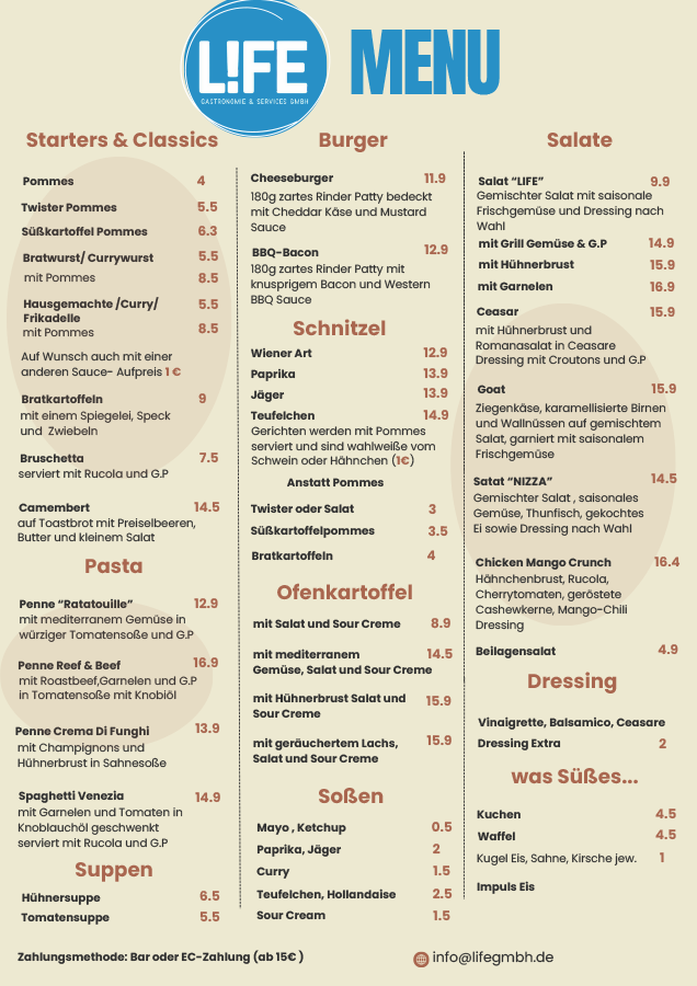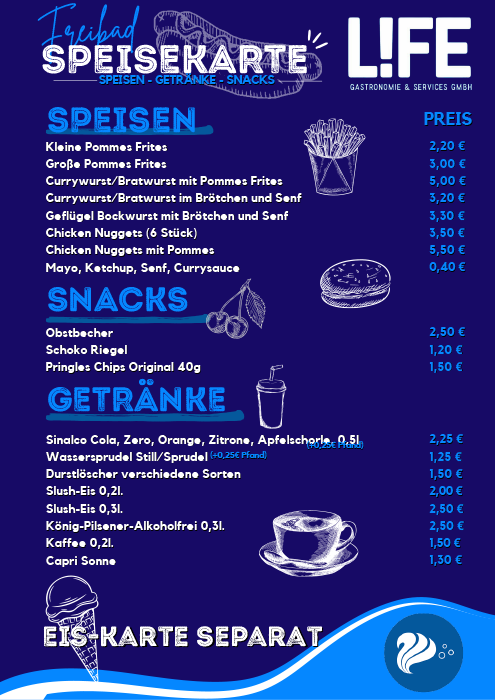 Speisen, Snacks und Getränke bietet Dir das Team des L!FE. Denn die beliebte Currywurst oder ne leckere Pommes Frites sorgen eben für den besonderen Moment und gehören zum Freibadbesuch auf jeden Fall dazu.